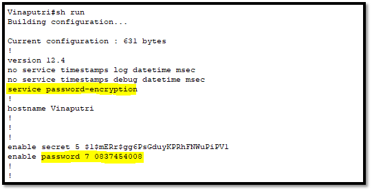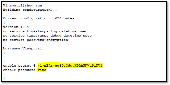 Kemudian kita verifikasi dengan perintah “show run”. Kemudian cari baris enable password dan enable secret.