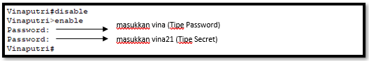 Diatas kita sudah melakukan setting 2 tipe password, yaitu Tipe Secret dan Tipe Password. Tetapi tetap yang akan digunakan adalah tipe Secret. Karena tipe secret yang terenskripsi dan menganggap itu yang paling aman meskipun tipe password telah kita enskripsi. Untuk pembuktian silahkan coba exit ke Mode User EXEC Mode. Kemudian masuk ke mode Privilege.