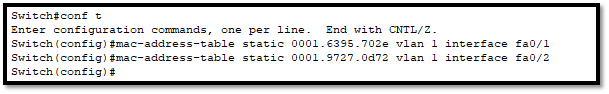 “Switch (config)# mac-address-table static [MacAddress] [Vlan] interface [fa0/1-24]”