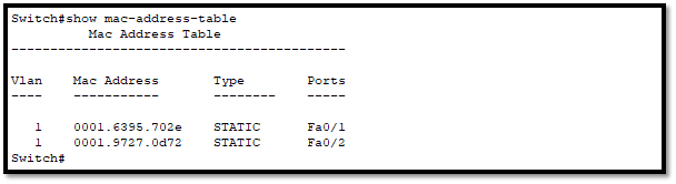 Bisa kita lihat type table mac address sudah berubah menjadi STATIC, selanjutnya untuk pengetasan tukar port antar PC lalu coba test ping, pasti tidak akan berhasil. Karena Switch sudah mencatat bahwa port fa0/1 adalah milik PC yang memiliki MAC Adress diatas.