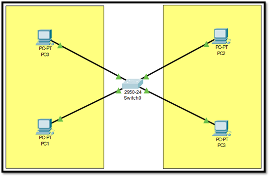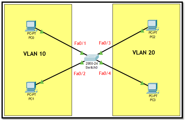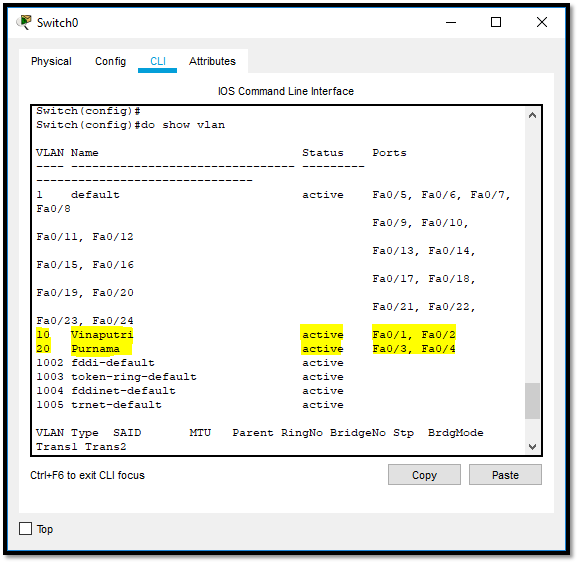 Bisa kita lihat, bahwa Switch secara default sudah memiliki VLAN 1 dengan nama default, lalu semua port yang dimiliki switch terdaftar di Vlan 1. Sekarang kita akan membuat Vlan 10 dan 20. Dan mendaftarkan PC sebelah kiri menjadi Vlan 10 dan PC sebelah Kanan menjadi Vlan 20.