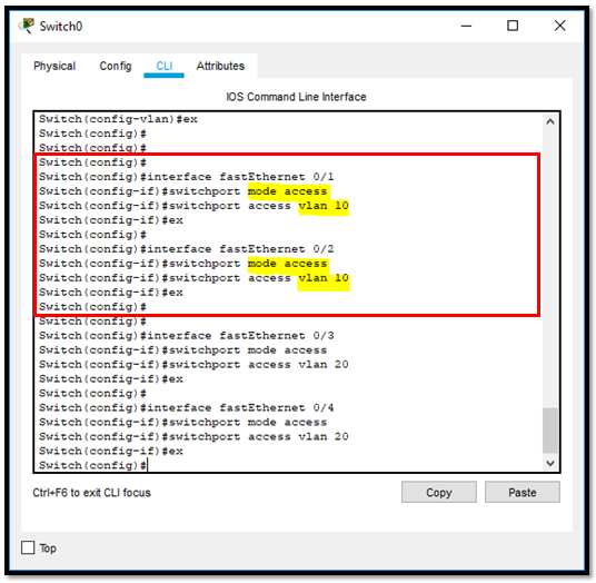 Apabila telah selesai membuat vlan, selanjuta nya daftar kan atau assign port-port nya kedalam vlan nya. jadi PC sebelah kiri adalah Vlan 10 dan sebelah Kanan adalah Vlan 20 maka kita masukkan seperti ini :