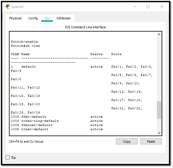 Kemudian kita akan memastikan bahwa semua port itu terdaftar ke Vlan 1, dengan perintah show vlan atau dengan cara ketikkan perintah “sh vlan”.