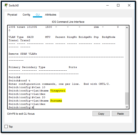 Baik pertama kita akan membuat terlebih dahulu Vlan beserta nama vlan nya. Caranya adalah masuk ke global configuration lalu buat seperti dibawah ini.