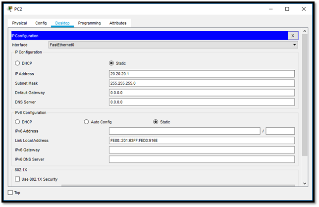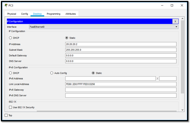 Setelah selesai meng-assign, sekarang waktunya pengujian. Untuk pengujiannya pertama kita setting IP terlebih dahulu di PC nya. Kita buat menjadi 2 Network. Yaitu Network Vlan 10 dan Network Vlan 20. Untuk IP nya bisa dilihat sebagai berikut