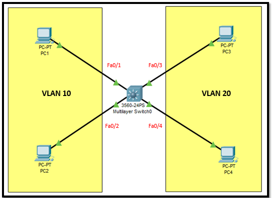 Baik langsung saja, pertama kita buat topologi seperti dibawah ini. Untuk jenis switch nya 3560-24ps.