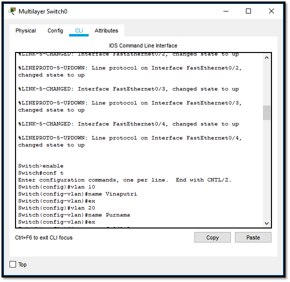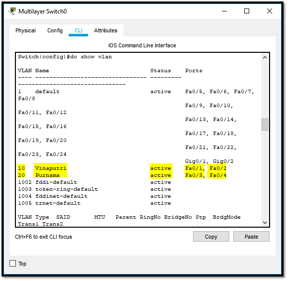 Langkah pertama adalah kita buat terlebih dahulu vlan 10 dan vlan 20 pada switch.