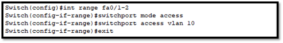“cara cepat untuk melakukan konfigurasi terhadap lebih dari 1 interface, yaitu dengan cara menambahkan sintak range di konfigurasi interface. sintak range artinya kita akan menkonfigurasikan range interface dari fa0/1 sampai fa0/2.”