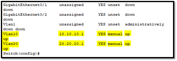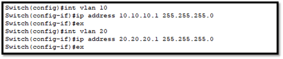 Selanjutnya kita berikan IP ke masing-masing interface vlan, IP ini lah yang nantinya akan dijadikan gateway dari PC untuk dapat saling berkomunikasi antar vlan.