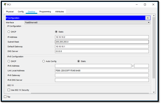 Apabilah telah selesai, Selanjutnya kita masuk ke pengujian, pertama setting IP nya terlebih dahulu. Lalu jangan lupa masukkan gatewaynya, untuk PC yang berada di vlan 10 kita beri gateway 10.10.10.1 dan untuk pc yang berada di vlan 20 kita beri gateway 20.20.20.1.