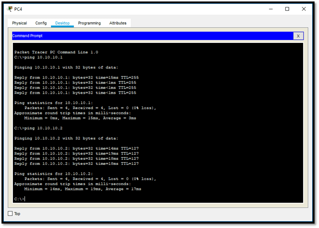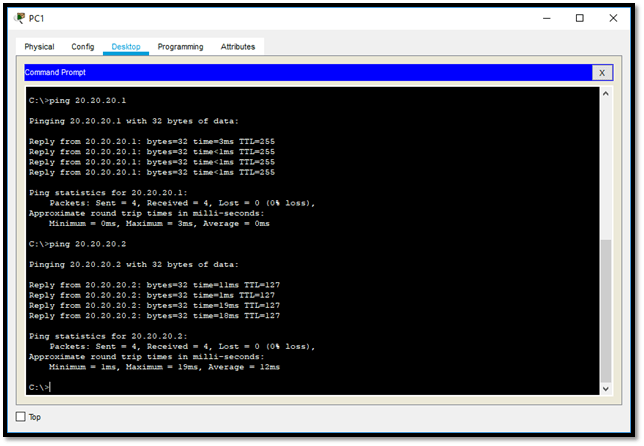- Ping PC4 ke PC1 (PC1 Vlan 10 dan PC4 Vlan 20)