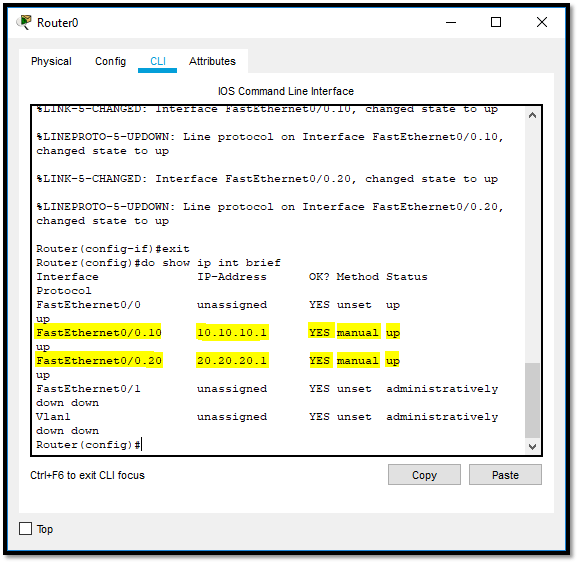 Setelah itu kita cek lagi IP dari interface nya, dan pastikan di interface fa0/0 sudah terdapat sub-interface seperti dibawah ini.