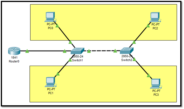 Disini masih menggunakan topologi dan konfigurasi sebelumnya, Oke langsung saja ke konfigurasinya, setelah sesama vlan dapat saling berkomunikasi selanjutnya kita buat jalur trunk dari Switch-1 ke Router.