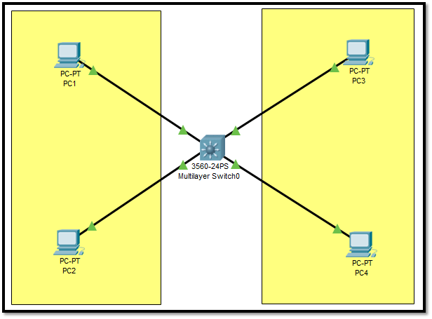 Masih dengan topologi yang sama seperti di lab sebelumnya, disini kita akan membuat DHCP Server di Switch. Jadi untuk membuat DHCP Server di switch hanya bisa dilakukan di switch layer 3 saja, dan tidak bisa di switch layer 2.
