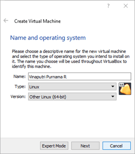 1. Langkah Pertama, buat mesin baru di Virtual Box lalu isi kolom nya seperti dibawah ini: