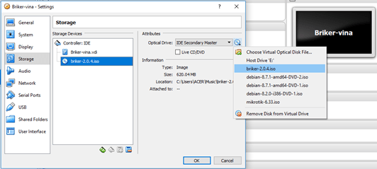 5. Apabila sudah berada di menu settings, kemudian kita pilih “Storage” dan kita masukkan ISO nya, dikarenakan kita ingin menginstal Briker Jadi kita Pilih “ISO Briker 2.0.4”. Jika sudah selanjutnya Klik OK.