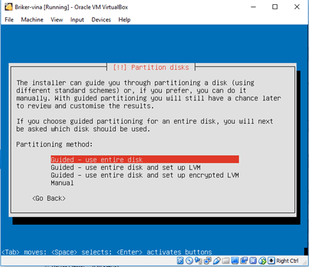 11. Selanjutnya kita diminta untuk mempartisi disk. disini kita pilih “Guide – use entire disk”.