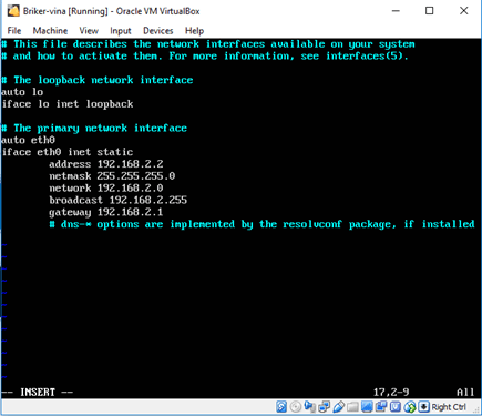 17. Maka akan ada tampilan seperti berikut. Disini kita bisa mengkonfigurasi network seperti address, netmask, network, broadcast, dan gateway.
