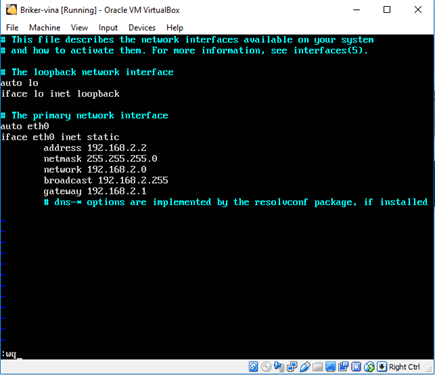 18. Jika sudah selesai mengkonfigurasi IP, selanjutnya kita tekan tombol Esc lalu ketik “ :wq “ untuk menyimpan dan keluar dari file tersebut.